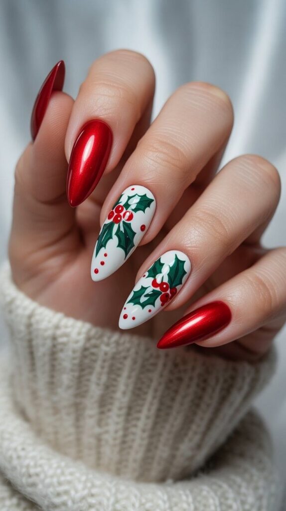 “Soft white polish frames glossy red tips on all five nails, but two accent nails feature delicate green holly leaves and red berries. It’s clean, elegant, and totally photo-ready — like wearing a winter art exhibit on your fingertips.”