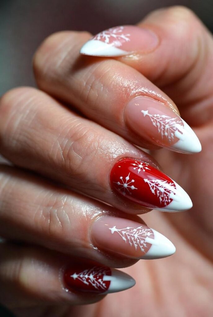 “Soft nude polish frames delicate white snowflakes on each nail, while one finger gets a glittery red accent that sparkles like fresh snow. It’s clean, elegant, and totally photo-ready — like wearing a winter art exhibit on your fingertips.”