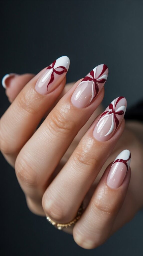 “Soft nude polish frames crisp white tips on four nails, while the ring finger steals the show with a giant red bow. It’s clean, elegant, and totally photo-ready — like wearing a winter art exhibit on your fingertips.”