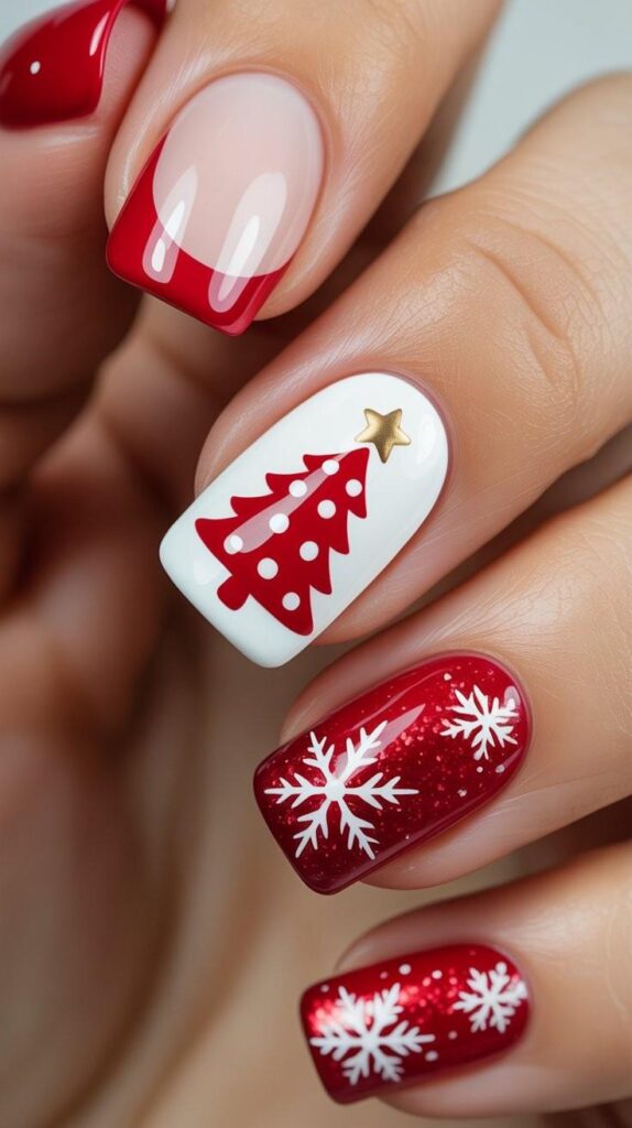 “Soft white polish frames a tiny red Christmas tree topped with a gold star on the ring finger — simple, elegant, and totally wearable. The rest? Clean, classic, and totally low-key — sweet, serene, and perfect for everyday wear.”