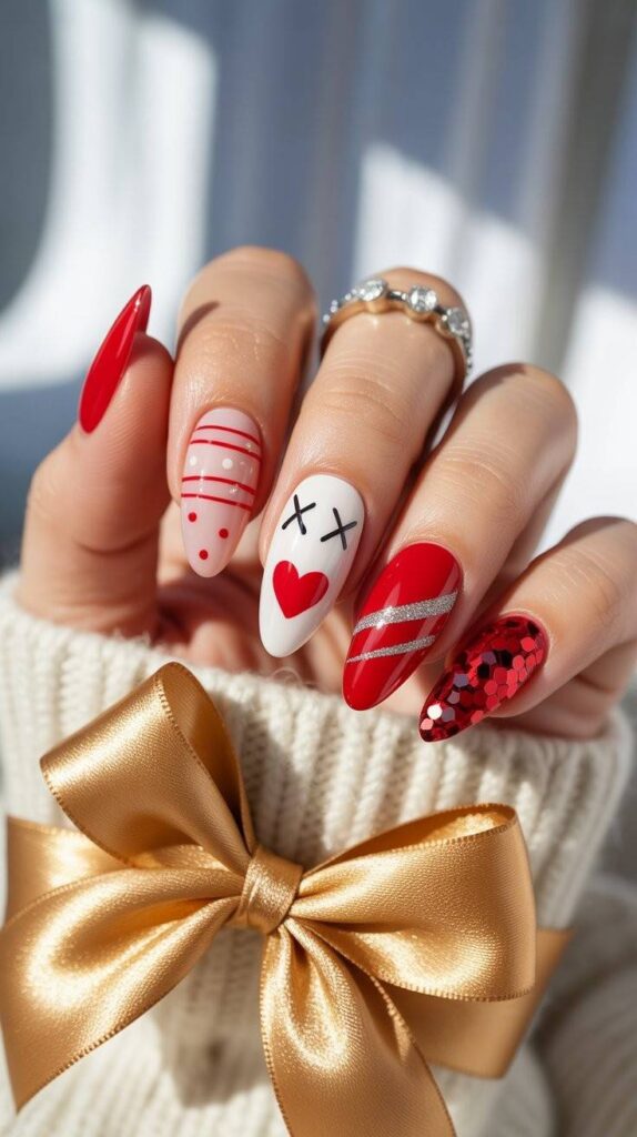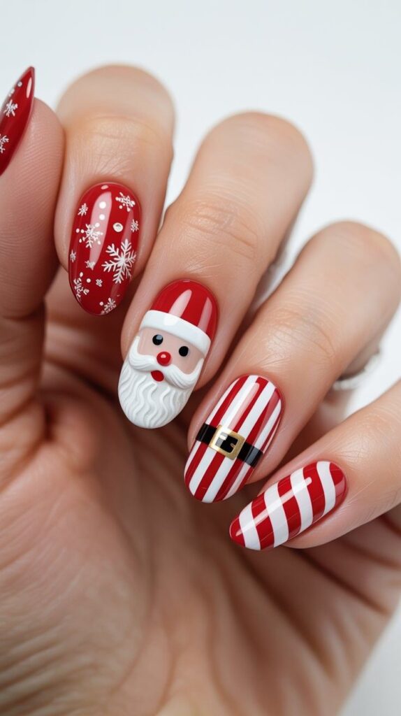 “Glossy red and white polish frames a tiny Santa face, a red-and-white candy cane, and a giant red heart — all clustered together like a little winter scene. It’s playful, classic, and totally Instagram-worthy — like wearing a Christmas card on your fingertips.”