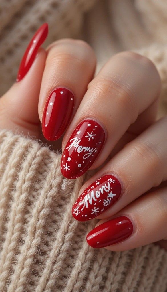 “Glossy red polish frames delicate white snowflakes on each nail, while the ring finger steals the show with the word ‘Merry’ written in elegant cursive. It’s sweet, serene, and totally wearable — like wearing a holiday card on your fingertips.”