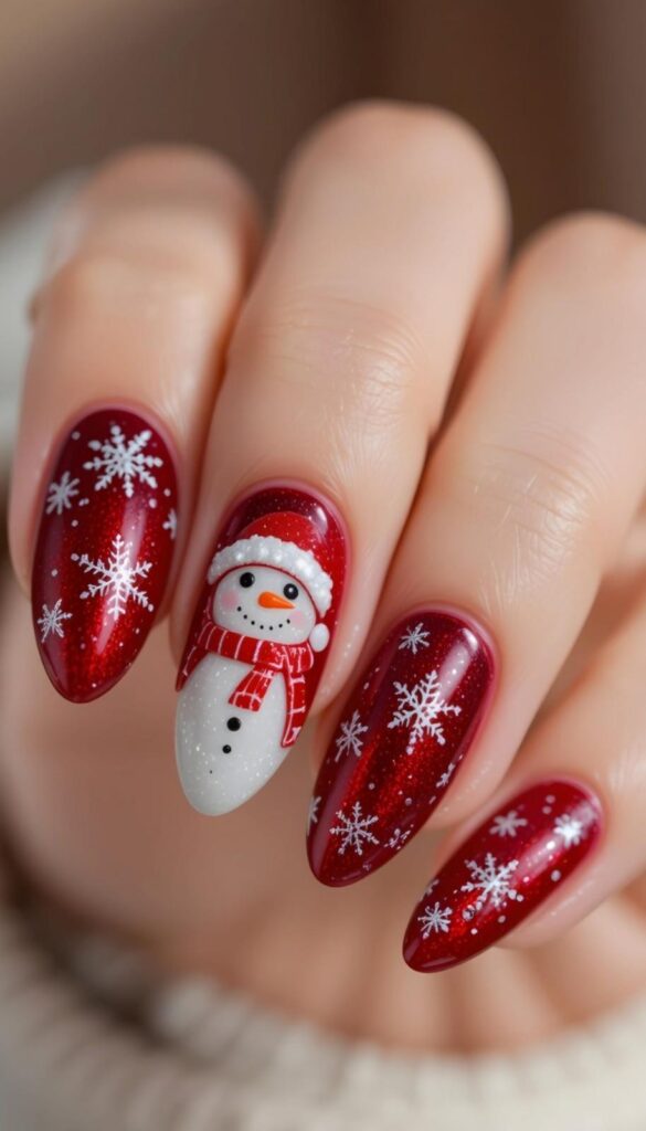 “Glossy red polish frames delicate white snowflakes on each nail, while the ring finger steals the show with a tiny snowman face — complete with a red hat and scarf. The other nails? Sprinkled with micro-glitter for that ‘twinkling night sky’ vibe — charming, not childish.”