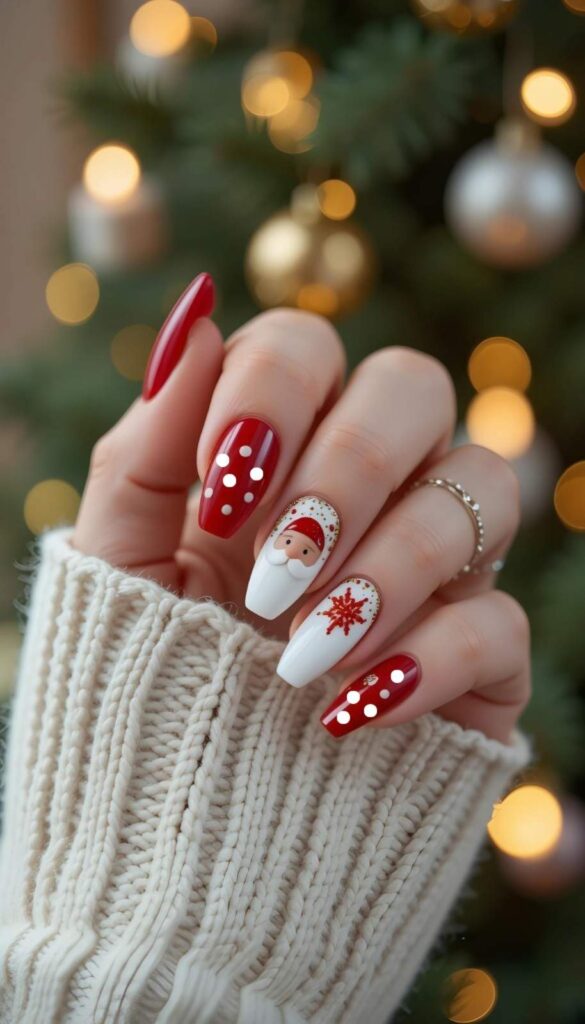 “Glossy red polish frames crisp white polka dots on four nails, while the ring finger steals the show with a giant Santa face — complete with antlers and a red nose. It’s bold, cheerful, and totally Instagram-worthy — like wearing a holiday sweater on your nails.”