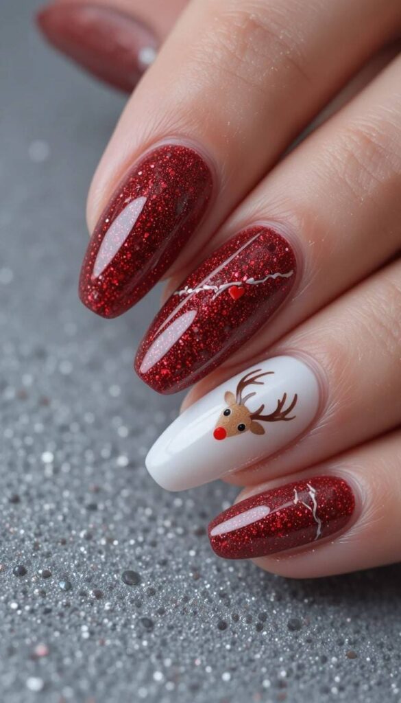 “Glossy red glitter polish frames crisp white stripes on two nails, while the ring finger steals the show with a tiny reindeer face — complete with antlers and a red nose. It’s clean, elegant, and totally photo-ready — like wearing a winter art exhibit on your fingertips.”