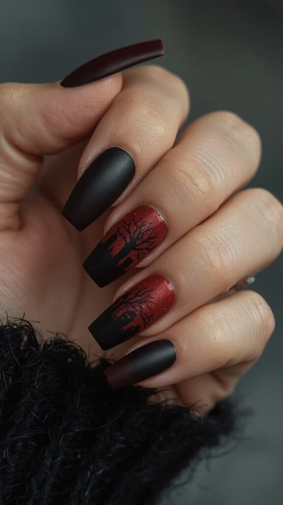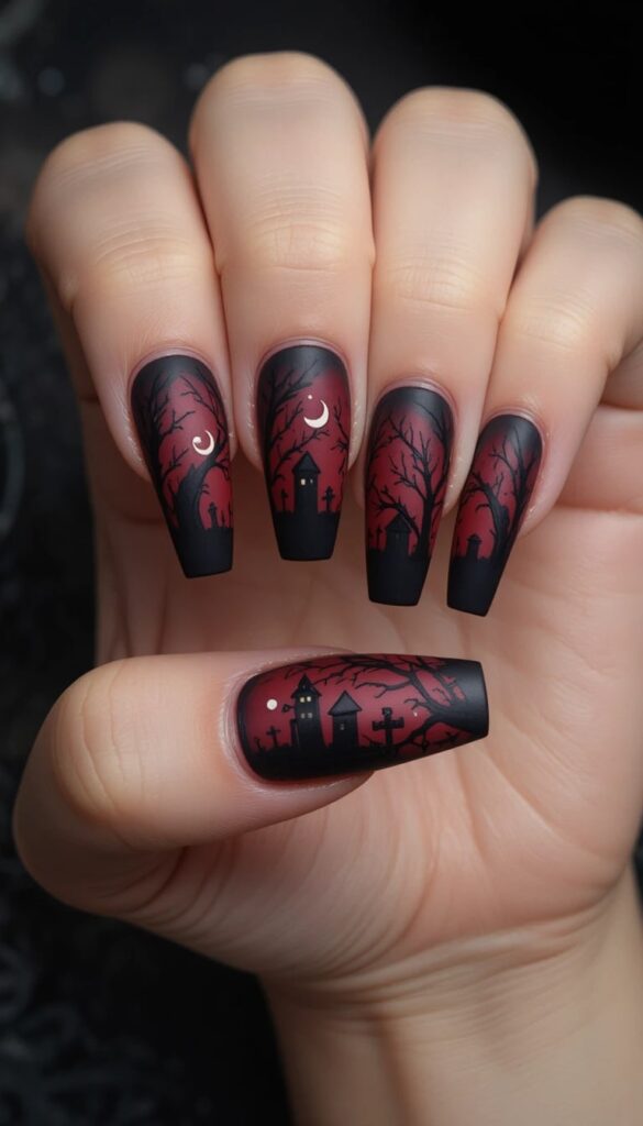 Velvety matte black nails fade into deep red at the tips — each nail features a haunting silhouette of bare trees and a graveyard. The coffin shape adds drama, while the gradient enhances the mystery. It’s moody, artistic, and full of Halloween soul.