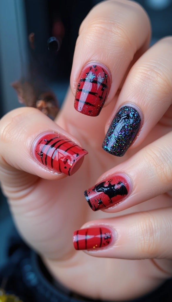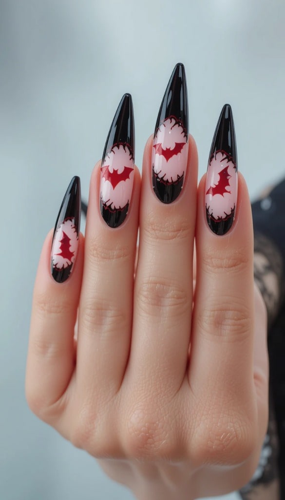 16) Black & Red Bat Silhouette Nails