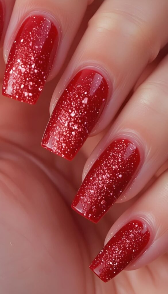 21) Glittery Ruby Red Nails – Festive & Bold
