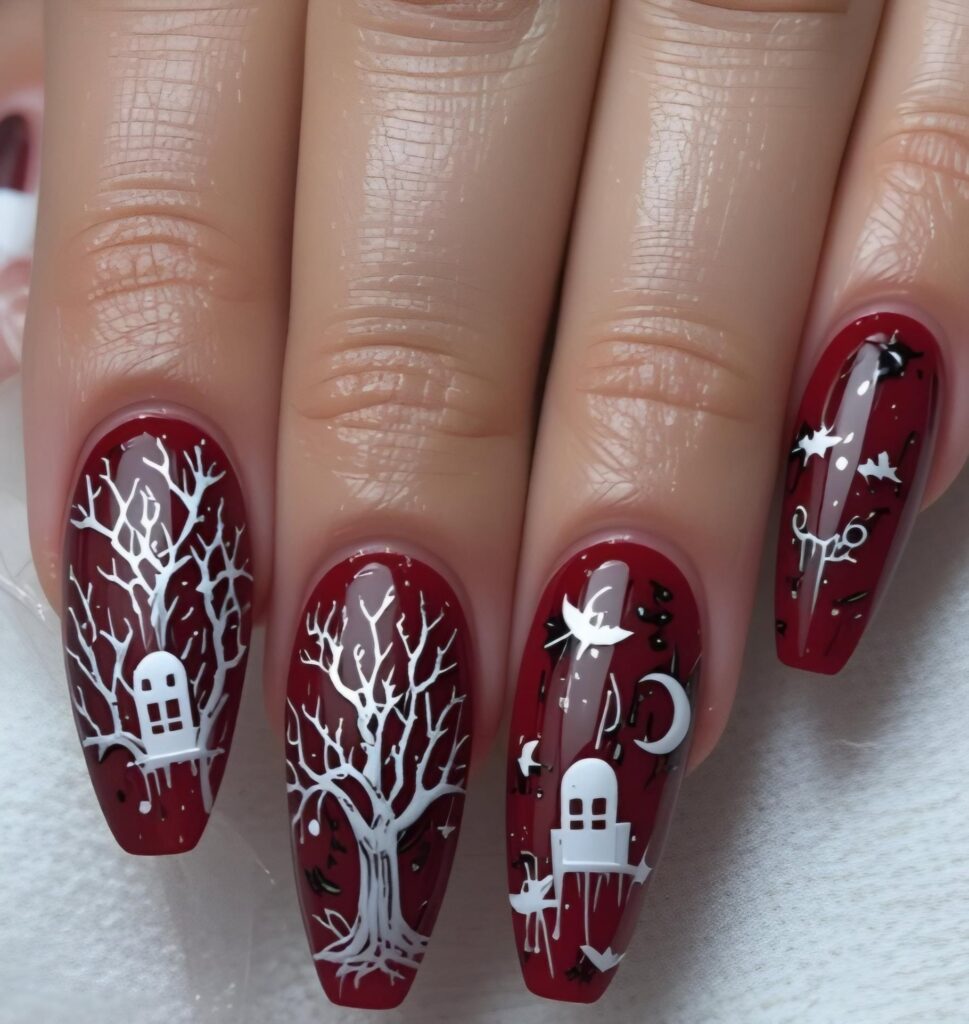 9) Burgundy Nails with White Haunted House & Tree Accents