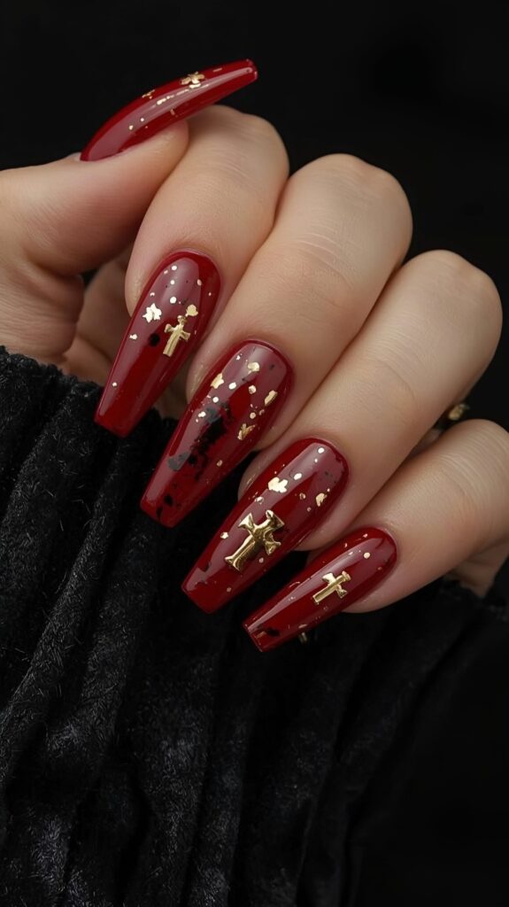 Deep, glossy burgundy nails shimmer with delicate gold leaf flakes and tiny cross charms — like sacred relics under candlelight. The coffin shape adds sleekness, while the metallic contrast brings luxury. It’s not just spooky… it’s gothically glamorous.