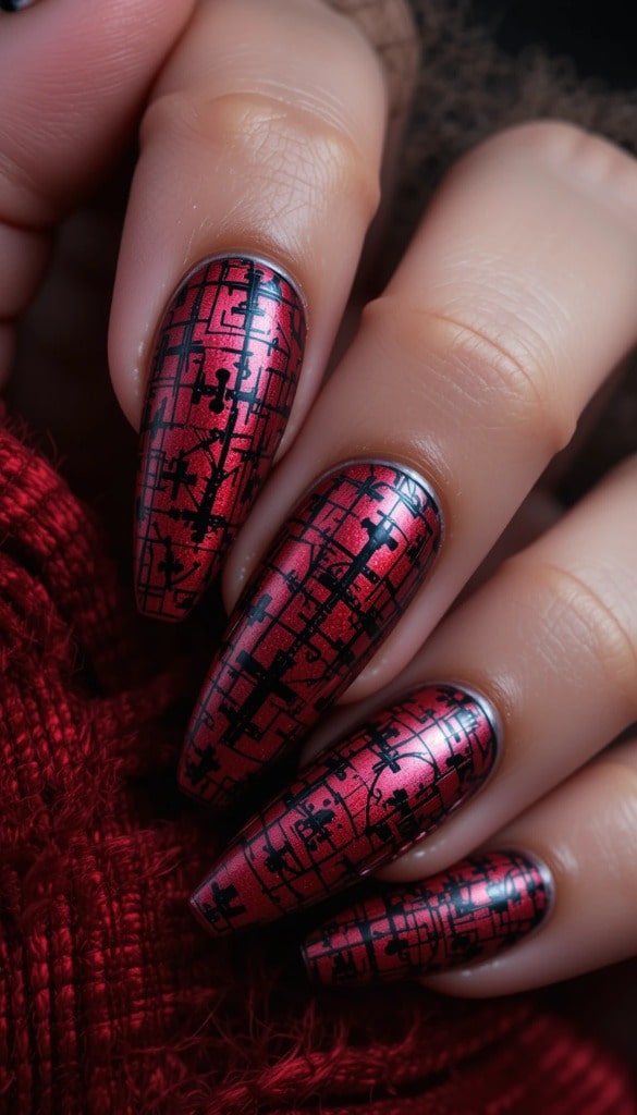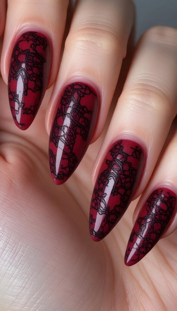 10) Deep Red Lace Pattern Nails – Gothic Glam