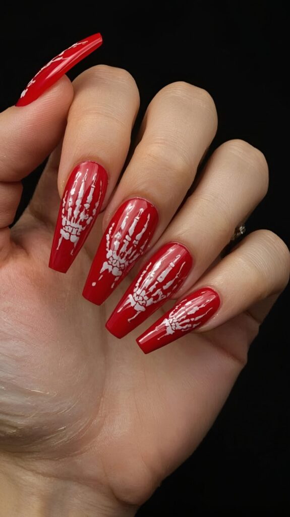 5) Bold Red Nails with White Skeleton Hand Accents
