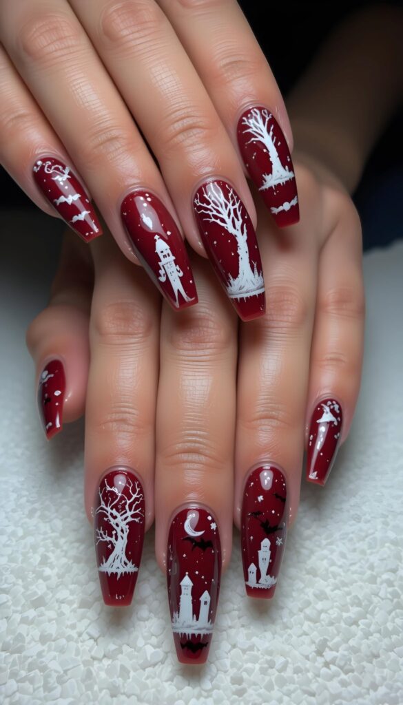 Rich burgundy nails bloom with delicate white tree branches, haunted houses, and flying bats — one nail even features a glowing moon. The glossy finish enhances the detail, while the coffin shape adds sleekness. It’s artistic, moody, and full of Halloween atmosphere.