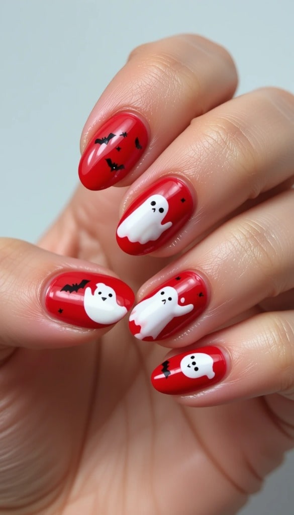 6) Cheeky Ghosts & Bats on Red Nails