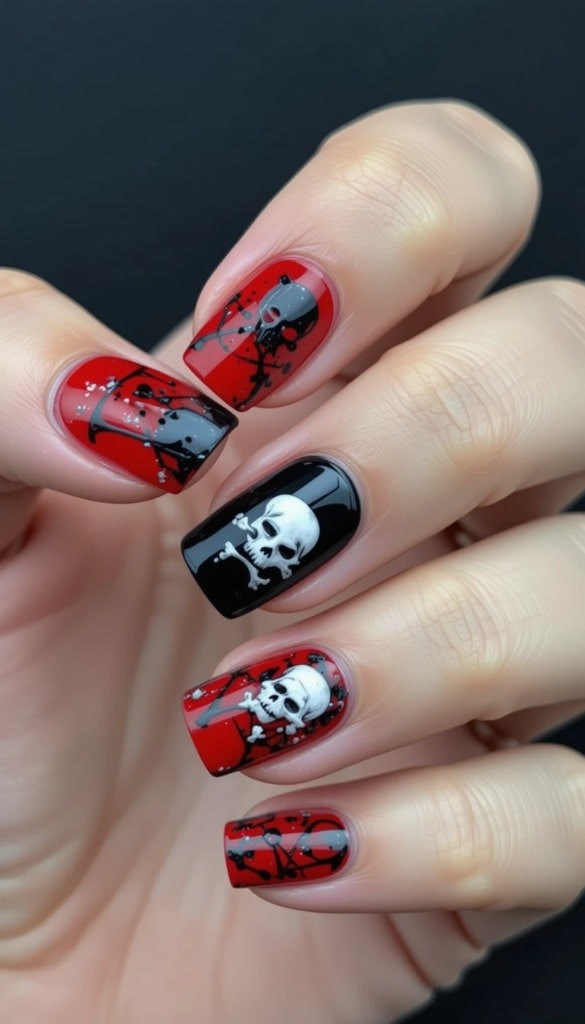 19) Red & Black Skull & Crossbones Nails