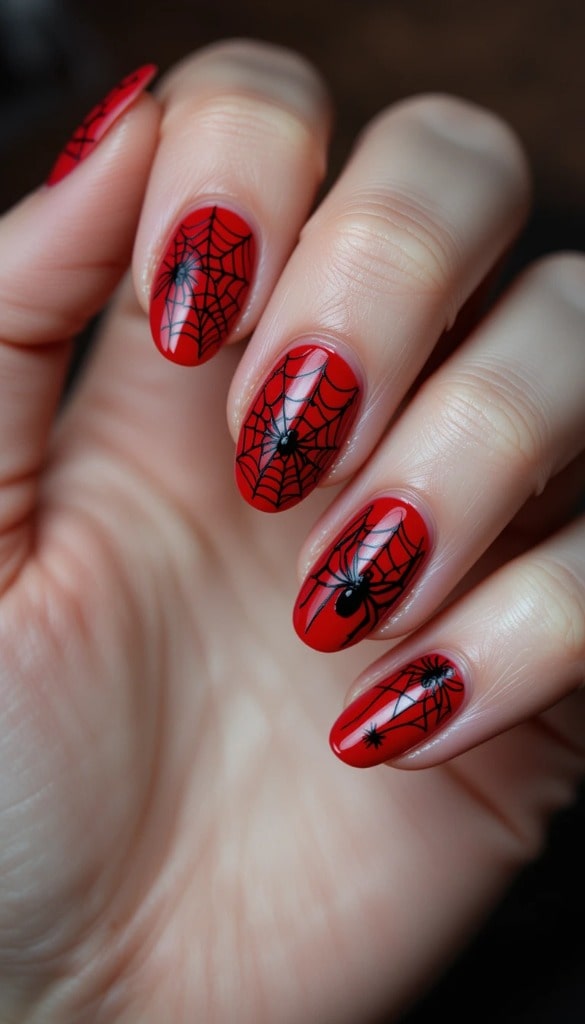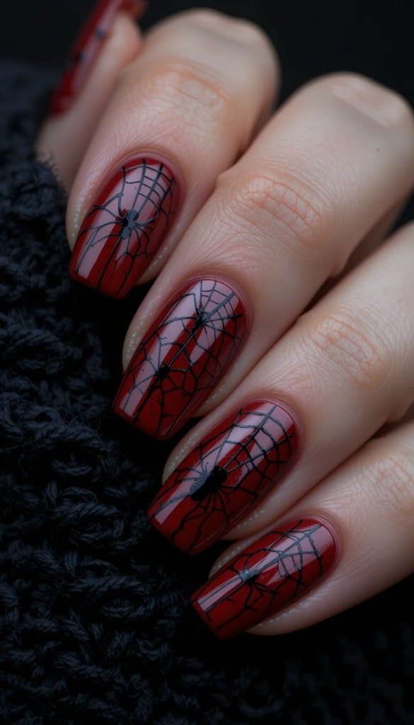 11) Red Nails with Black Spiderweb Accents