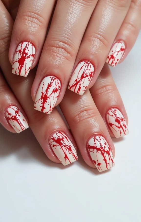 12) White Nails with Red Blood Splatter Accents