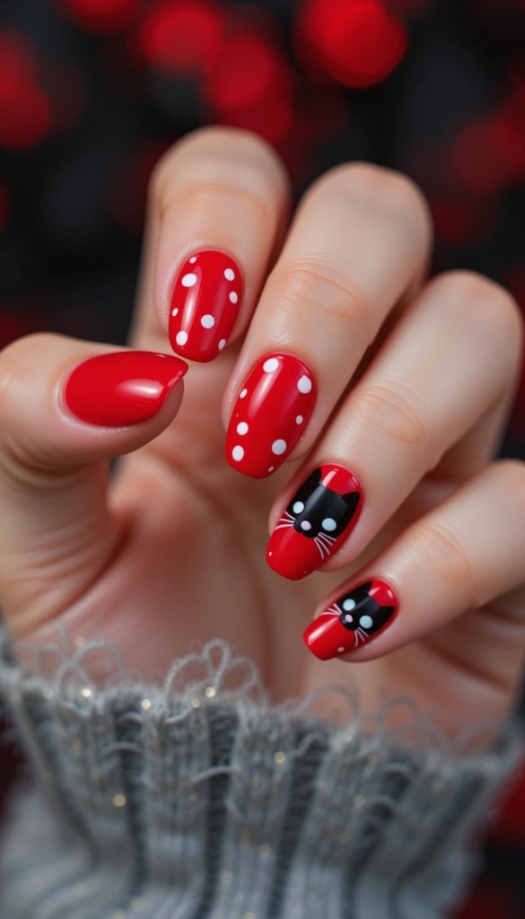 7) Red Polka Dots & Black Cat Nails