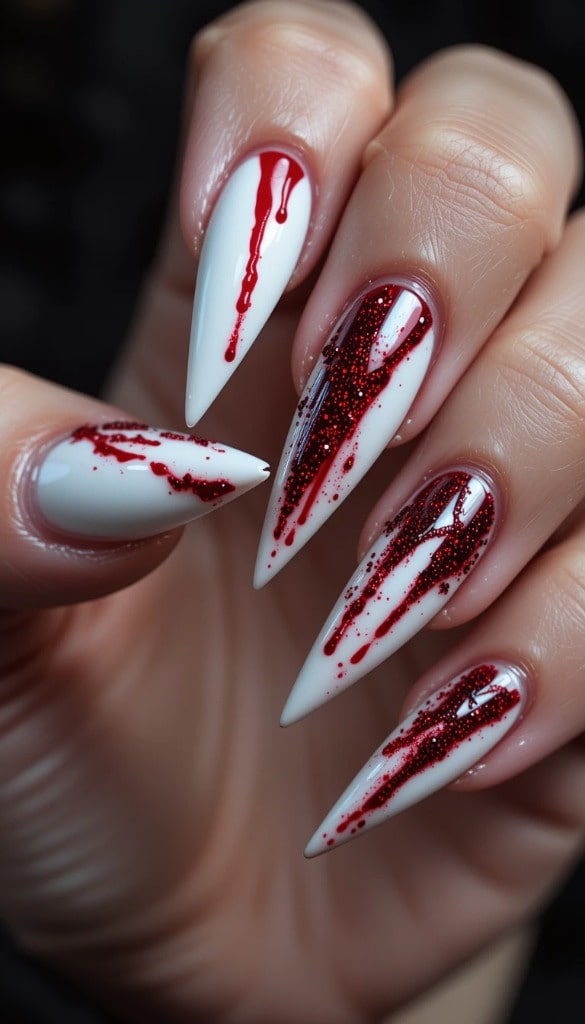 Glossy white nails drip with vibrant red “blood” — some smooth, some glittery, all perfectly placed. The long almond shape adds edge, while the contrast makes this look impossible to ignore. It’s not messy… it’s deliciously creepy.