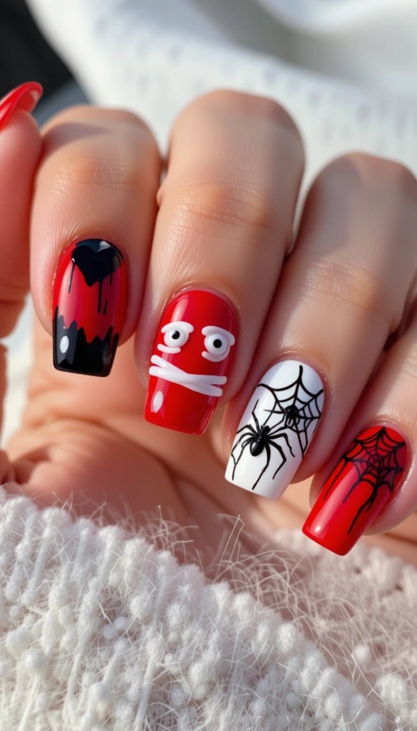 Bright red nails host one adorable mummy face with wide eyes and white bandages — two nails feature delicate black spiderwebs and a tiny spider. The glossy finish enhances the fun, while the coffin shape adds sleekness. It’s not just spooky… it’s playfully mischievous.