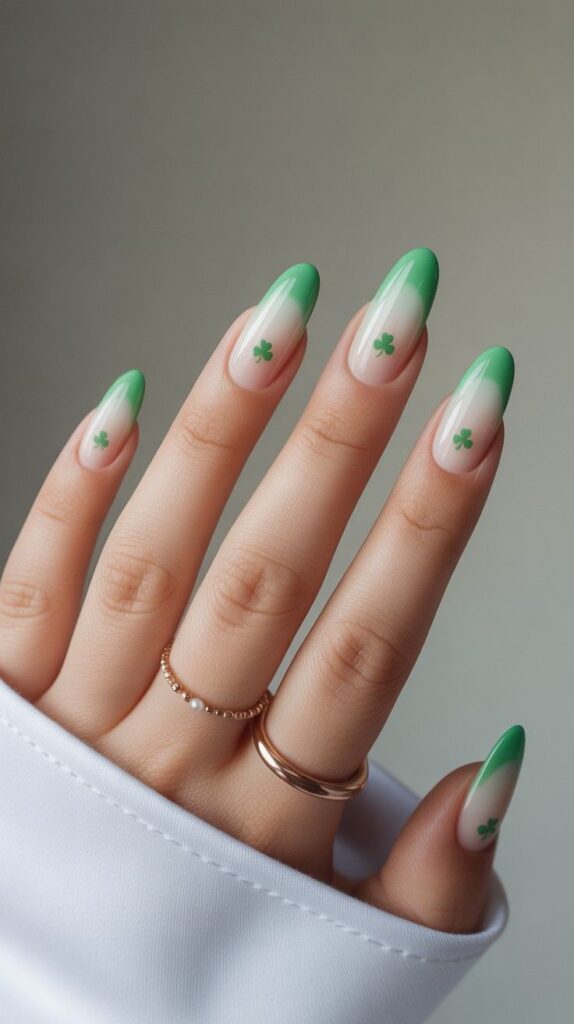 Soft nude-to-lime ombre short stiletto nails adorned with scattered miniature green shamrocks — gentle, dreamy, and full of spring energy. The gradient mimics sunlit meadows, and the glossy finish unifies the look. Wearable poetry on your fingertips.