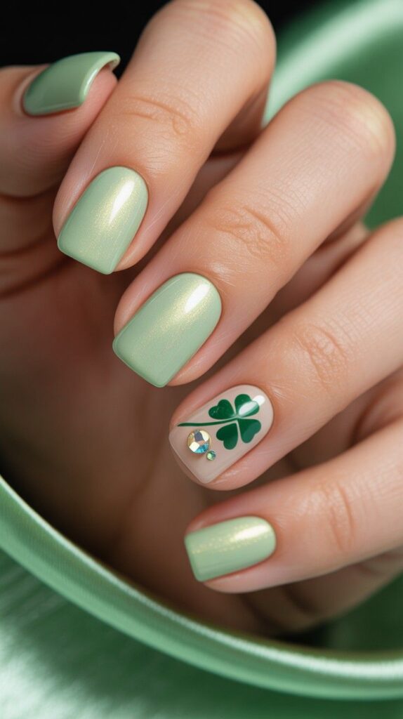 Glossy mint-green short oval nails with one accent finger featuring a delicate shamrock stem + leaf, accented by a micro AB rhinestone — luminous, fresh, and subtly luxurious. The iridescent sheen catches light like morning dew, and the short length keeps it practical. Luck, in soft shimmer.