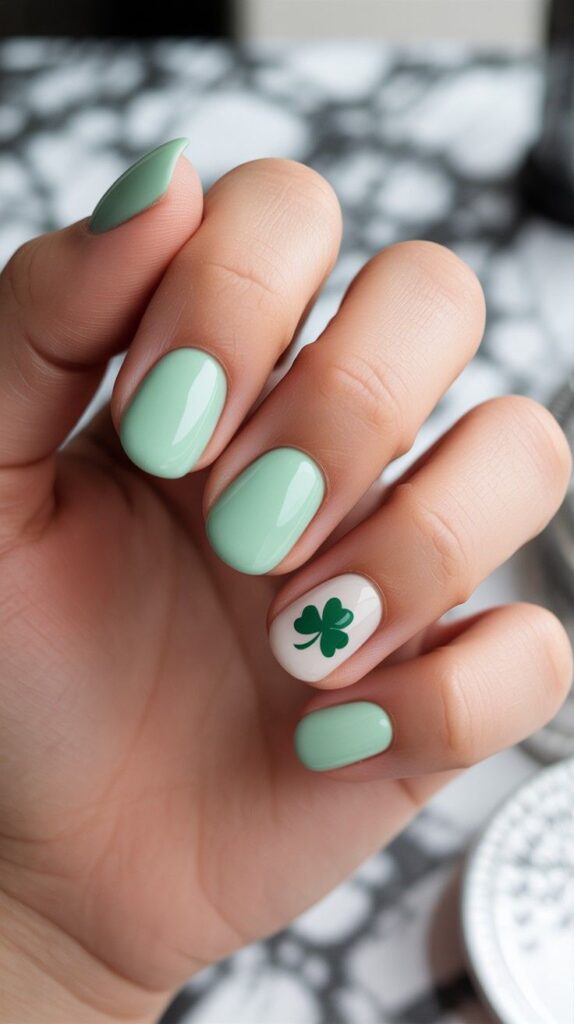 Delicate mint-green short rounded-square nails, one accent finger with a crisp white base and a single bold green shamrock — serene, modern, and effortlessly chic. The high-shine finish adds depth without glare, and the compact shape frames the hand with calm elegance. Luck, in soft focus.