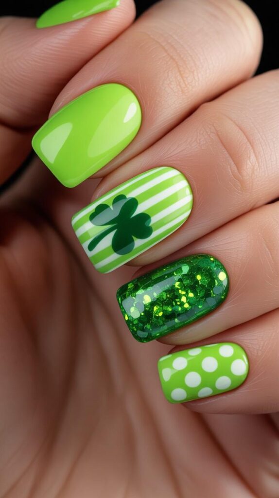 Vibrant lime-green short coffin nails paired with accent fingers in white-and-green stripes, holographic glitter, and polka dots — energetic, modern, and unapologetically fun. The mix of textures (gloss, sparkle, matte) creates visual rhythm, and the compact shape keeps it surprisingly wearable. Luck doesn’t whisper—it shines.