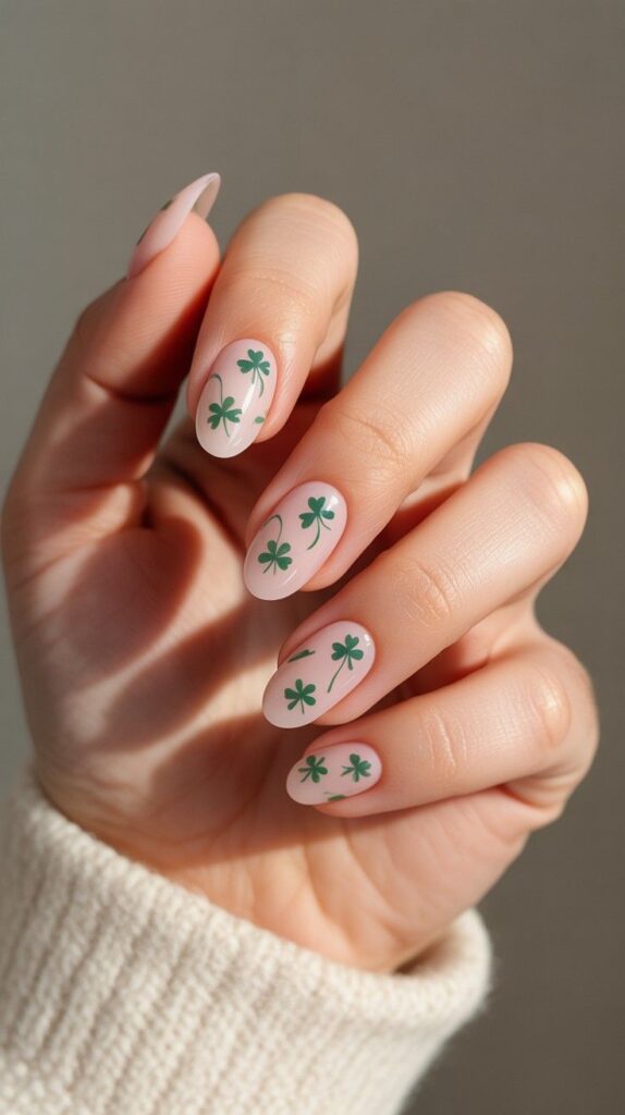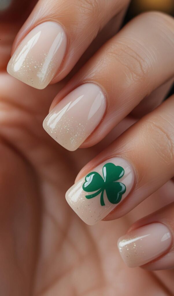 Soft nude short oval nails with subtle iridescent glitter fade and one accent finger featuring a single hand-painted green shamrock — delicate, luminous, and deeply romantic. The pearlescent shimmer shifts with light like morning mist, and the compact shape ensures all-day wearability. A whisper of magic, worn with grace.