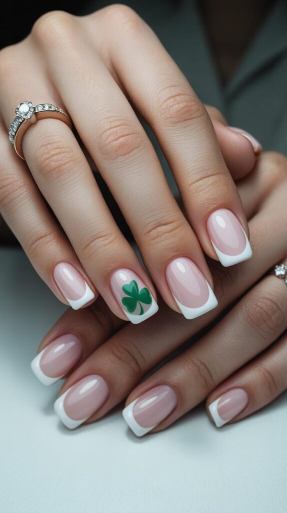 16) Nude French with Single Shamrock Accent