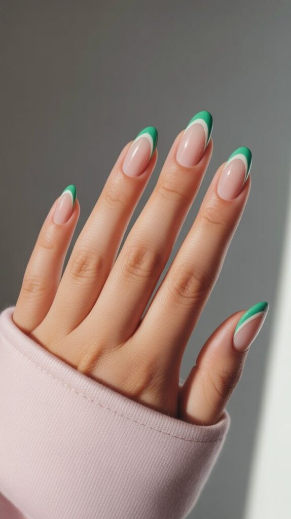 Soft nude short almond nails featuring a refined two-tone French tip: a delicate white curve layered beneath a vibrant emerald-green edge — clean, balanced, and full of understated elegance. The high-gloss finish enhances the precision of the line, and the compact shape ensures all-day comfort. Luck, worn like a quiet promise.