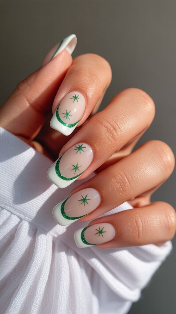 Crisp white short almond nails with soft nude tips, each accented by a curved green glitter stripe and a trio of mini green starbursts — whimsical, modern, and subtly festive. The high-shine finish makes the stars gleam like fairy lights, and the short length keeps it practical. Irish magic, in miniature.