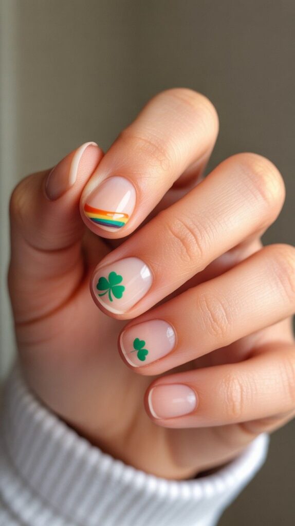 Soft nude short almond nails with one accent finger featuring a delicate rainbow stripe (red → orange → yellow → green) at the tip, paired with two others adorned with hand-painted green shamrocks — subtle, symbolic, and full of quiet magic. The glossy finish enhances the vibrancy, and the compact shape ensures all-day wearability. Luck, elegantly whispered.