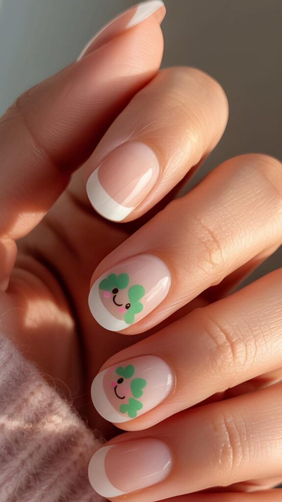 Nude-pink short rounded-square nails with crisp white French tips, two accents featuring adorable cartoon shamrocks with rosy cheeks, eyes, and smiles — sweet, playful, and deeply heartwarming. The glossy finish enhances the kawaii charm, and the short shape keeps it surprisingly durable. Love (and luck), served with a grin.