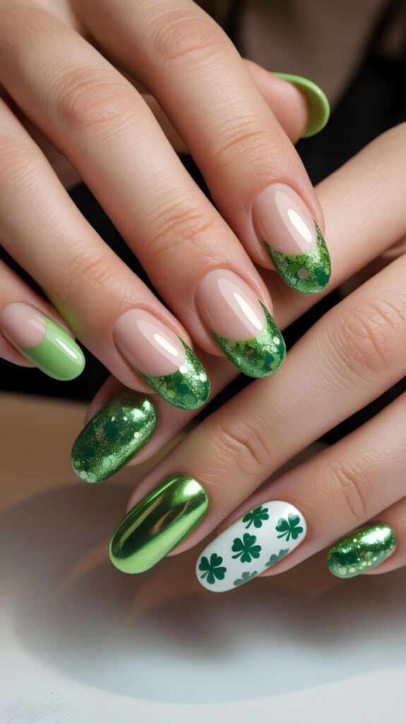 Glossy nude base short stiletto nails paired with vibrant chrome-green, glitter-dipped, and white-shamrock-accent fingers — bold, dimensional, and unapologetically festive. The metallic sheen catches light like polished jade, and the mix of textures creates visual harmony. Irish pride, reimagined for 2026.