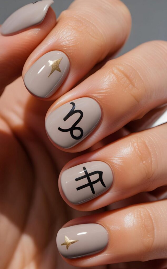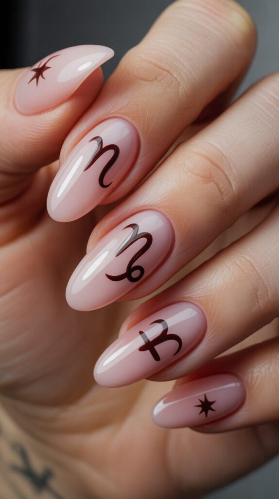 Soft taupe polish meets bold black Capricorn symbols and delicate gold stars — like a midnight sky captured in miniature. The glossy finish catches every glint of light, making it perfect for evening events or quiet nights under the stars. Paired with sharp almond shapes, this design whispers ‘grounded magic’ with every gesture.