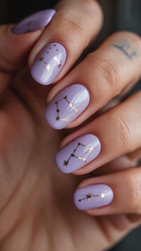 Soft lavender polish meets delicate gold constellation lines paved with micro-rhinestones — like a frozen forest captured in miniature. The glossy finish catches every glint of light, making it perfect for evening events or elegant winter weddings. Paired with lace fabric, this design whispers ‘luxury magic’ with every gesture.