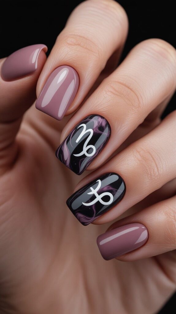 Rich dusty rose polish meets crisp white Capricorn symbols — modern, chic, and perfect for showing off your winter boots. The matte-to-glossy gradient adds depth, while the minimalist base lets the design shine. Paired with real snowflakes, this design whispers ‘minimalist magic’ with every step.