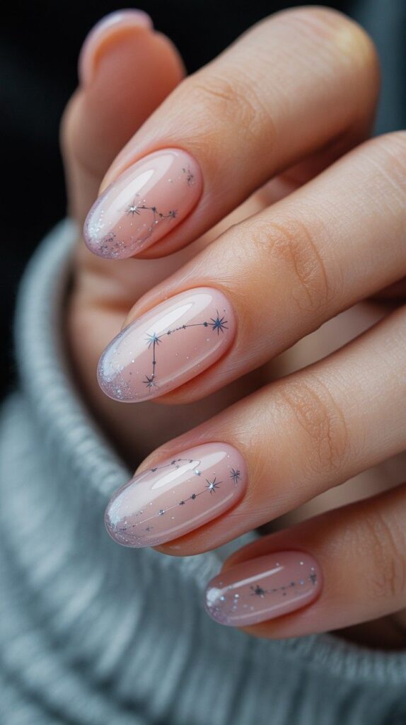 Soft blush pink polish meets delicate silver constellation lines — like a winter night captured in miniature. The glossy finish catches every glint of light, making it perfect for cozy nights in or festive gatherings. Paired with a soft knit sweater backdrop, this design whispers ‘icy magic’ with every glance.