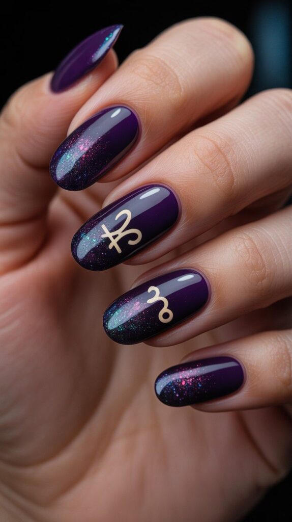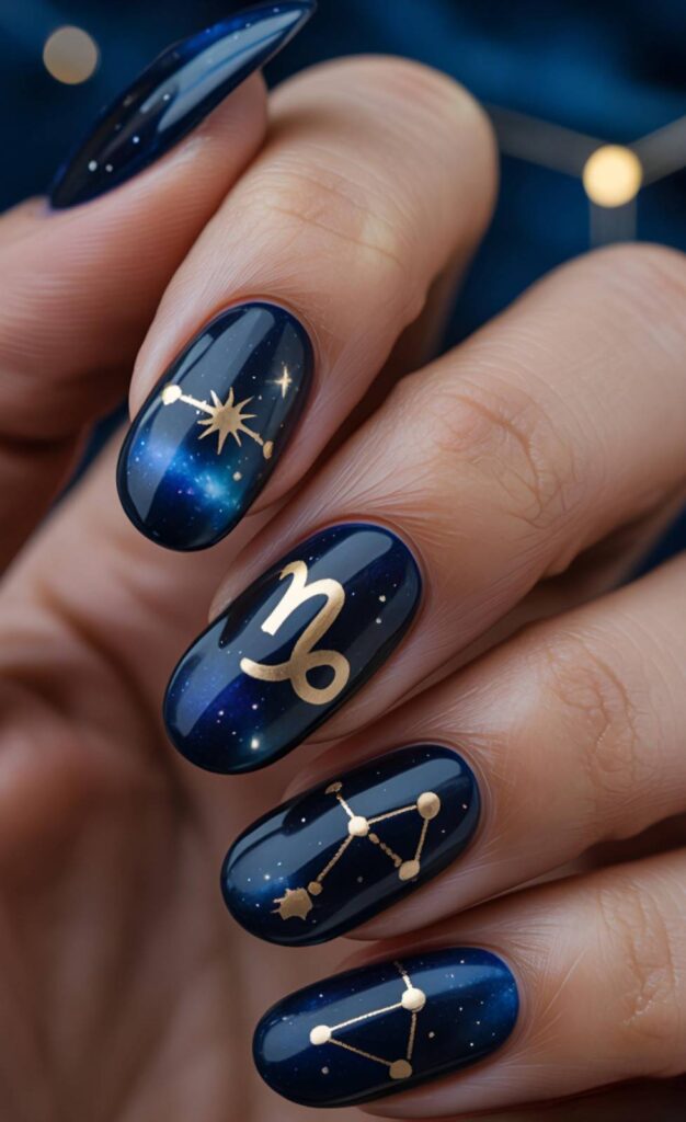 Deep navy galaxy polish shimmers with cosmic glitter, while each nail features bold gold Capricorn symbols and constellation lines — like a winter night captured in miniature. The glossy finish catches every glint of light, making it perfect for evening events or snowy strolls. Paired with twinkling lights, this design whispers ‘cosmic magic’ with every step.