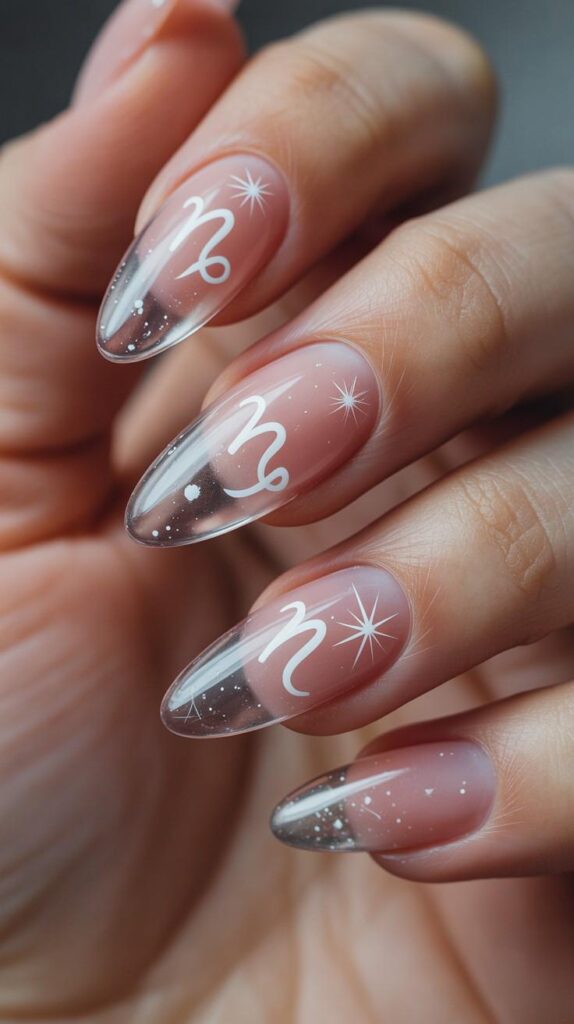 Clean nude polish meets crisp white Capricorn symbols — modern, chic, and perfect for showing off your winter boots. The matte-to-glossy gradient adds depth, while the minimalist base lets the design shine. Paired with real snowflakes, this design whispers ‘minimalist magic’ with every step.