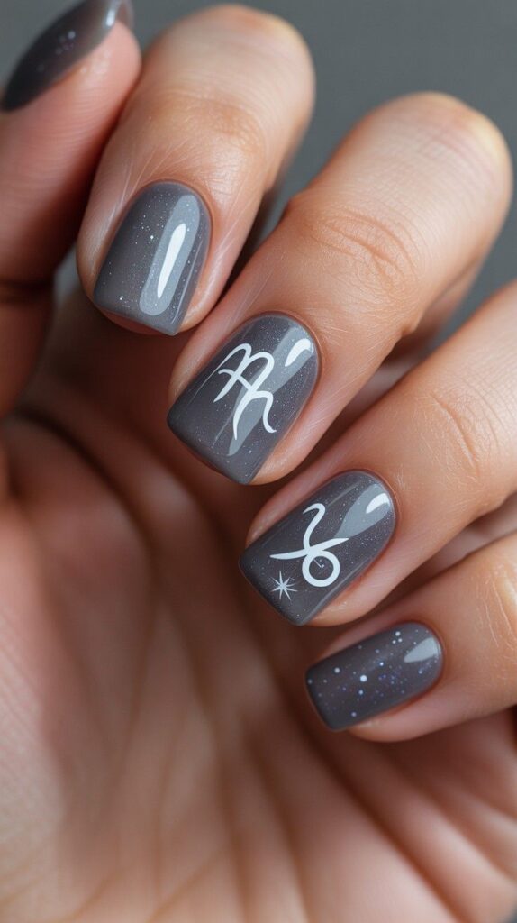 Rich grey glitter polish meets crisp white Capricorn symbols — modern, chic, and perfect for showing off your winter boots. The matte-to-glossy gradient adds depth, while the minimalist base lets the design shine. Paired with real snowflakes, this design whispers ‘minimalist magic’ with every step.
