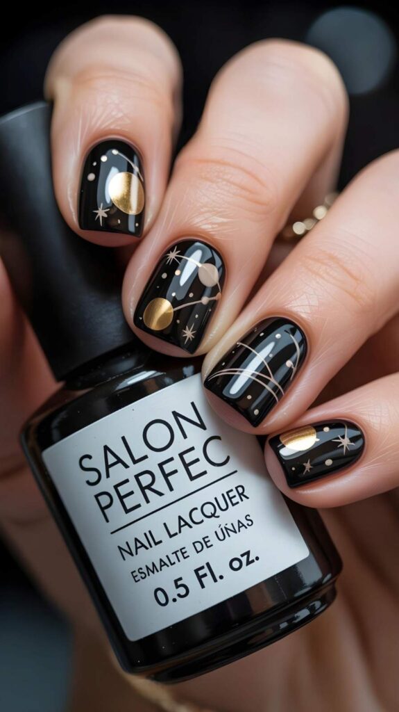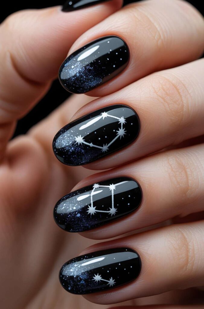 Deep black galaxy polish shimmers with cosmic glitter, while each nail features delicate white constellation lines — like a winter night captured in miniature. The glossy finish catches every glint of light, making it perfect for evening events or snowy strolls. Paired with twinkling lights, this design whispers ‘cosmic magic’ with every gesture.
