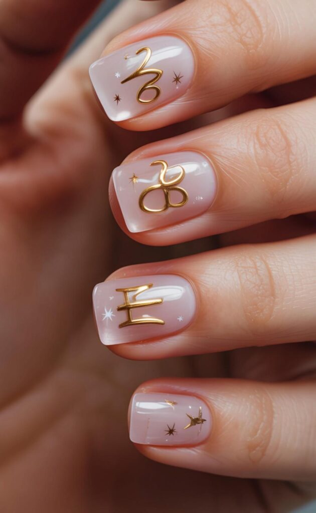 Soft blush pink polish meets sculpted gold Capricorn symbols and tiny glitter stars — like a celestial love letter painted on your nails. The glossy finish catches every glint of light, making it perfect for romantic dinners or gifting yourself a little cosmic energy. Paired with square stiletto shapes, this design whispers ‘elegant magic’ with every glance.
