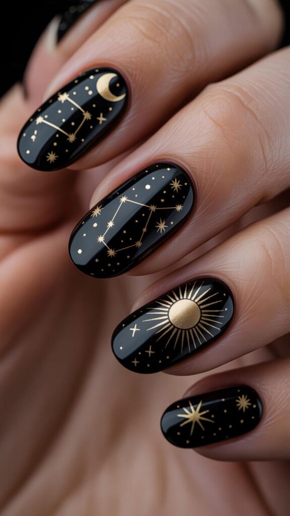 Deep black polish meets bold gold constellations, moons, and sunbursts — like a celestial map painted on your nails. The glossy finish catches every glint of light, making it perfect for evening events or quiet nights under the stars. Paired with sharp almond shapes, this design whispers ‘mystical magic’ with every gesture.
