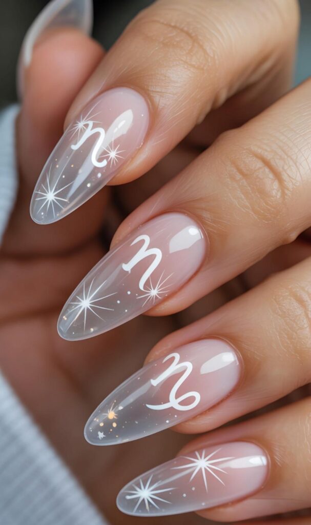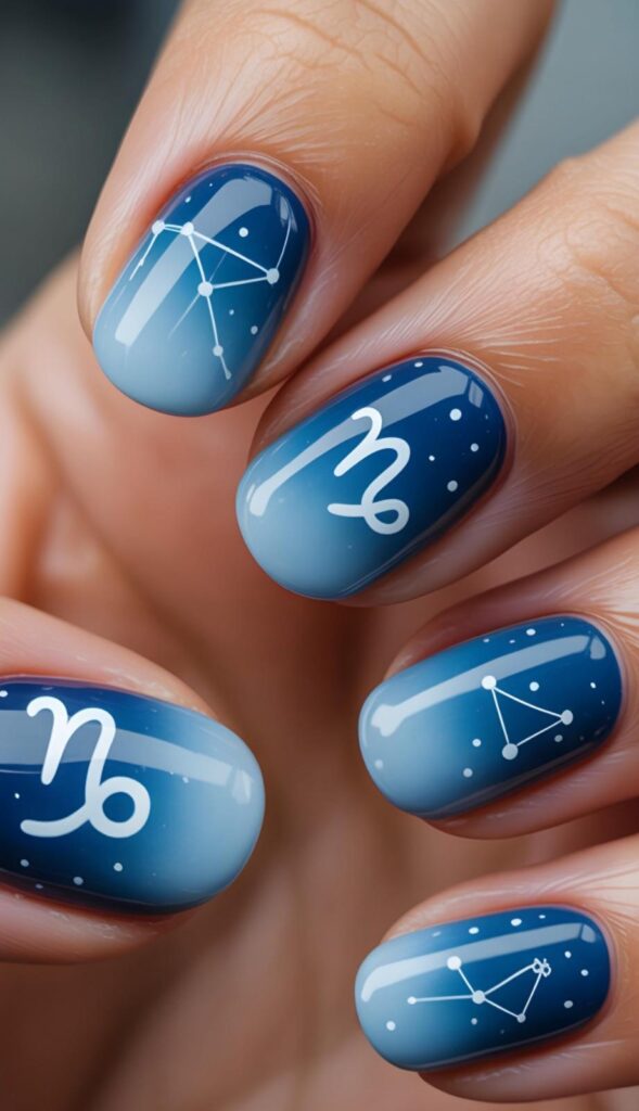 Deep royal blue fades into soft white, while each nail features delicate white Capricorn symbols and constellation lines — like a winter storm captured in miniature. The glossy finish catches every glint of light, making it perfect for evening events or snowy strolls. Paired with a snowy backdrop, this design whispers ‘cosmic magic’ with every gesture.