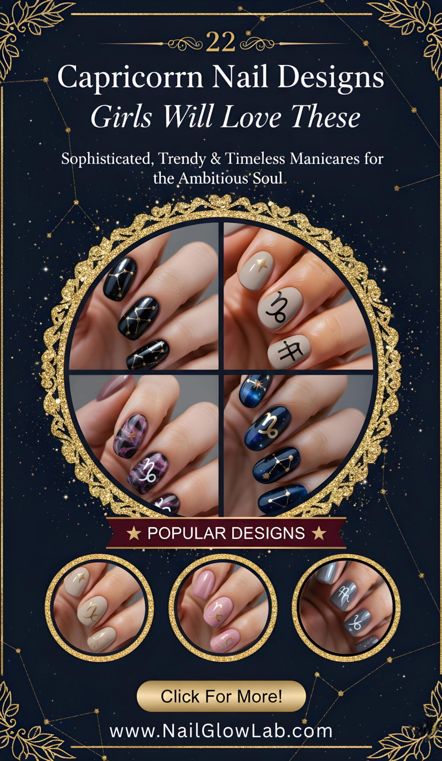 Capricorn isn’t just a sign — it’s a vibe. Ambitious. Elegant. Earthy. Mystical. And if you’re drawn to midnight skies, gold accents, constellation lines, or minimalist elegance, this collection is made for you. From bold black galaxies to soft nude glimmers, sculpted gold symbols to cosmic constellations — these 22 Capricorn nail designs are here to match every mood, from quiet nights under the stars to glamorous galas.