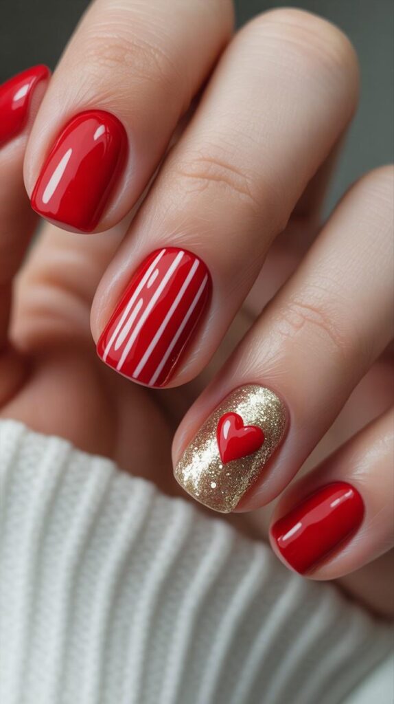 Glossy true-red short squoval nails meet a single glitter-gold accent nail with a bold red 3D heart — timeless, festive, and effortlessly chic. The contrast between deep color and sparkling texture adds dimension without bulk, while the short length ensures comfort for daily life. A modern take on vintage romance.