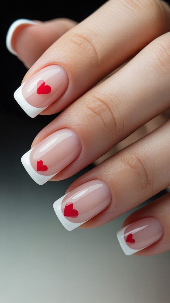 17) Nude French with Red Heart Tips