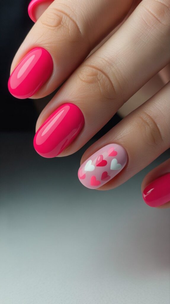 Vibrant neon pink short squoval nails meet one blush accent nail dotted with mini hearts in red, pink, and white — playful, energetic, and full of youthful love. The glossy finish enhances the pop of color, while the compact shape ensures comfort for typing, texting, or holding hands. A joyful burst of affection, perfectly sized.